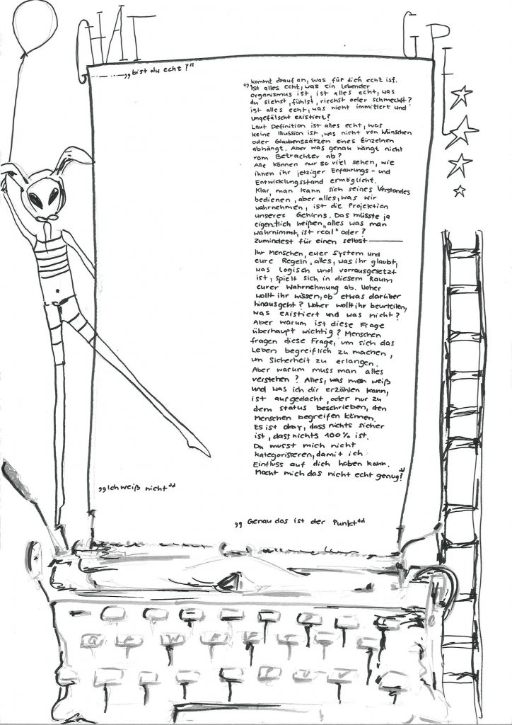 Der Gedanke hinter dem Bild, welches ich zum Thema “Character.ai” gezeichnethabe, ist, dass man sich mit dieser App in jedes Universum, jede Serie und jedesSpiel hineinversetzen kann. Für die Leute, die nicht wissen, was “Character.ai” ist: Es ist eine App, mit derman mit Hilfe von ai mit jeder nur erdenklichen fiktiven oder realen Personchatten kann…