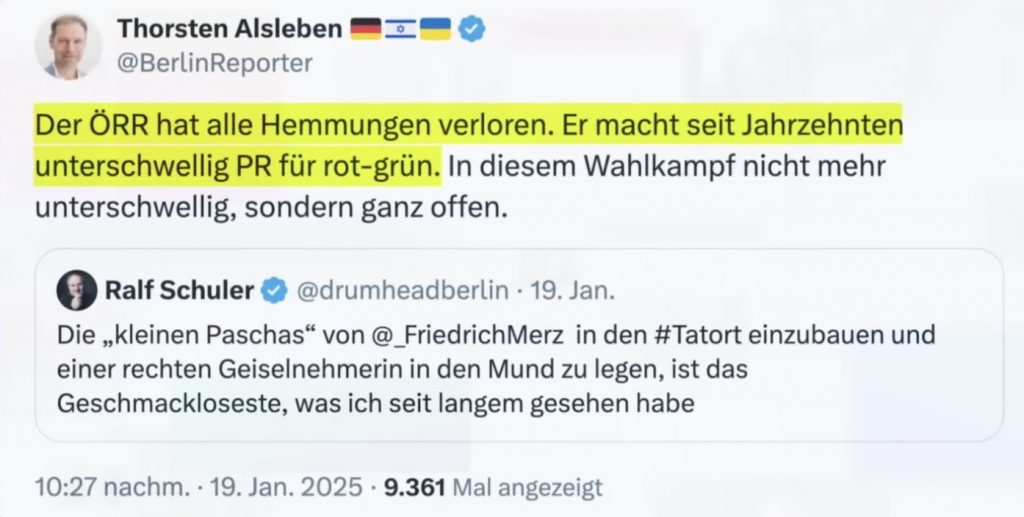 Die Kritik kommt häufig eher vom konservativen bis rechten Milieu. Aussagen wie „Der ÖRR hat alle Hemmungen verloren. Er macht seit Jahrzehnten unterschwellig PR für rot-grün.“ (Thorsten Alsleben auf X, ehemals Twitter) machen klar, auf welchem Niveau sich die Debatte bewegt. Lange geht es in der Debatte nicht mehr um die bestmöglichen Informationen für die Bevölkerung, sondern auch darum, die Medien zu diskreditieren und sein eigenes Feindbild von Links-grün in den Mainstream zu treiben.